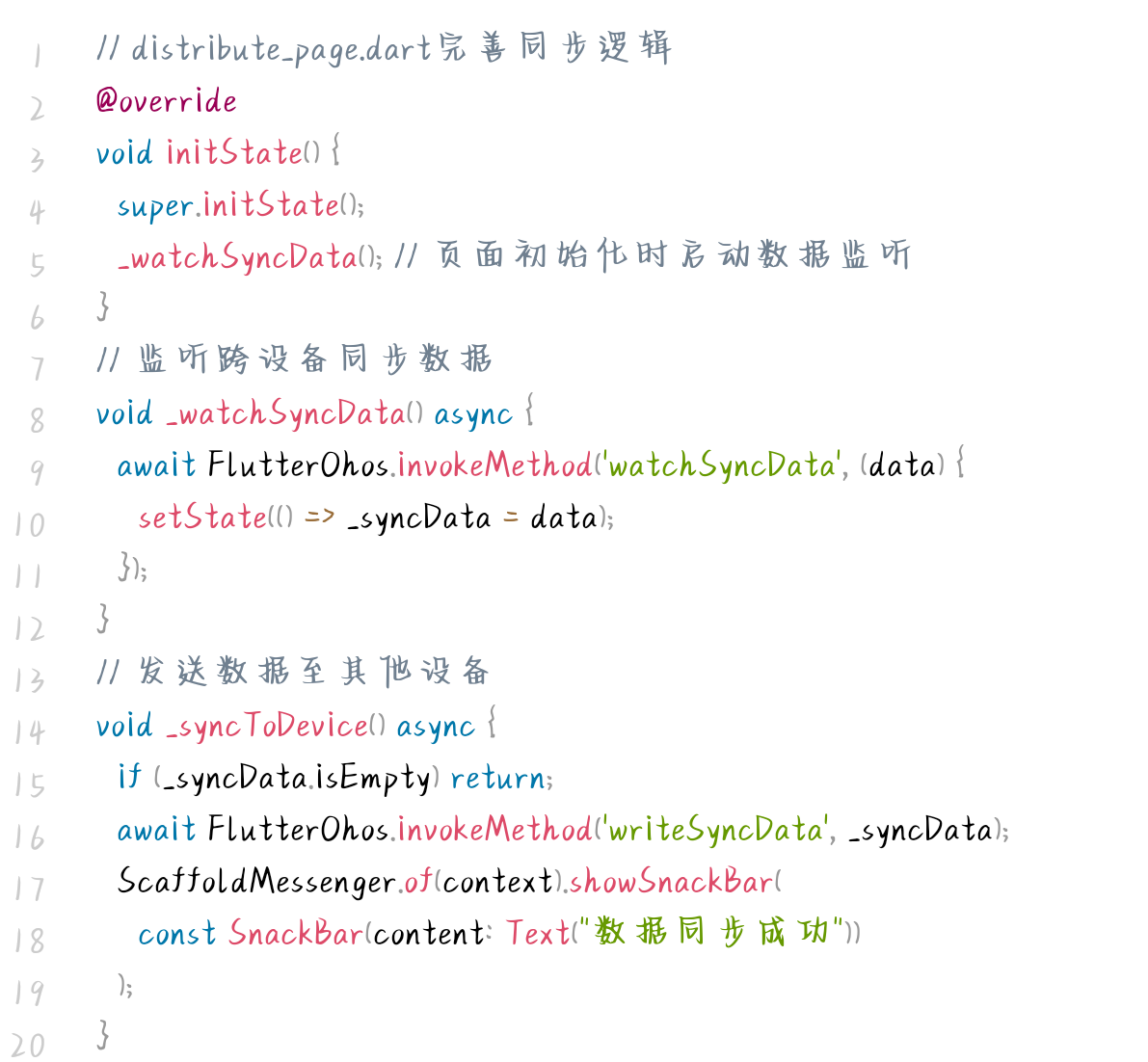 - 分布式适配层:封装鸿蒙分布式设备管理、数据同步能力,提供Dart语言可调用的标准化接口,实现Flutter与鸿蒙分布式能力无缝桥接;