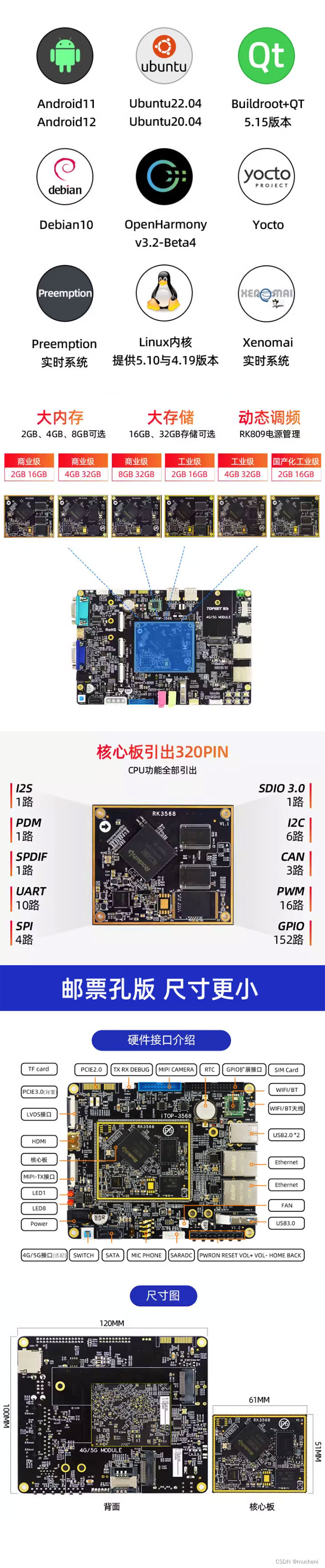 系统支持:Android12系统,Android11系统,buildroot+QT系统,yocto系统,Debian10系统,Ubuntu20.04、Ubuntu18.04、OpenHarmony3.2 LTS。与邮票孔两种,商业级2G、商业级4G、商业级8G、工业级2G、工业级4G、国产化工业级2G多种核心板引脚兼容,适用于同一底板,产品升级自如,适用于各个应用场合。支持显示屏:MIPI7寸屏、