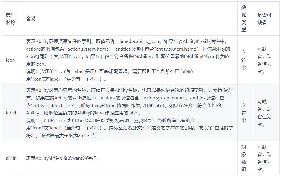PageAbility的相关配置在config.json配置文件的"module"对象的"abilities"对象中,"icon"属性表示Ability图标资源文件的索引,"lable"属性表示Ability对用户显示的名称,"skills"属性表示Ability能够接收的want的特征。