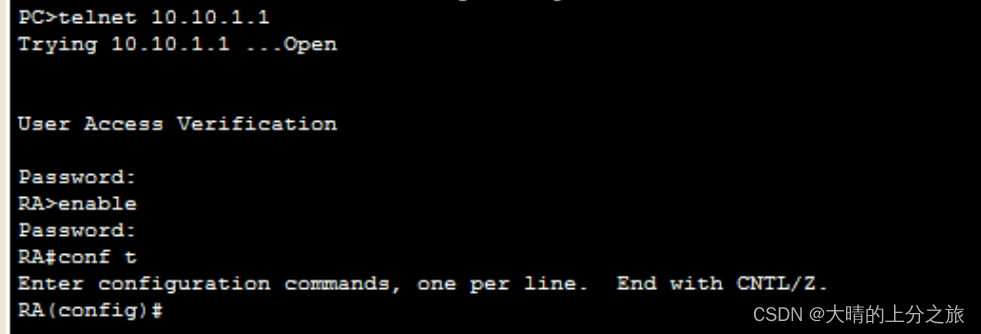 使用PC1或PC2的命令模式对远程登录进行验证,使用telnet命令远程登录到路由器后进入路由器的特权模式、全局配置模式可对路由器进行配置: