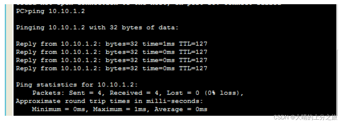 用ping命令测试路由器是否设置成功,PC1 ping PC2成功则设置成功。