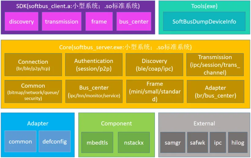 - Adapter:软总线适配层,对不同系统进行裁剪和能力配置,对外部依赖进行包装和调用;