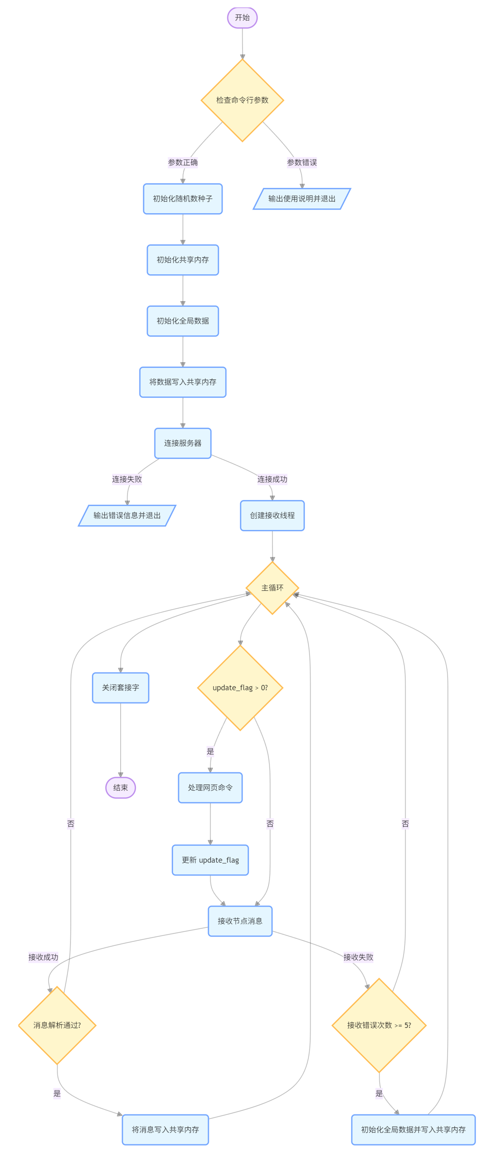 程序通过网络与服务器进行通信,接收和发送消息,并使用共享内存与其他进程进行数据交互。它使用多线程来提高程序的并发性能,同时对网络连接和消息接收进行了错误处理,确保程序的稳定性。