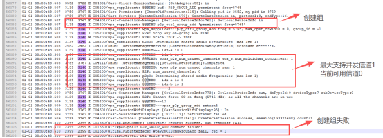艾克斯采用的wifi模组不支持跨频段并发,在连接到A信道的wifi的时候不支持同时在信道B作为GO,所以创建组会失败。