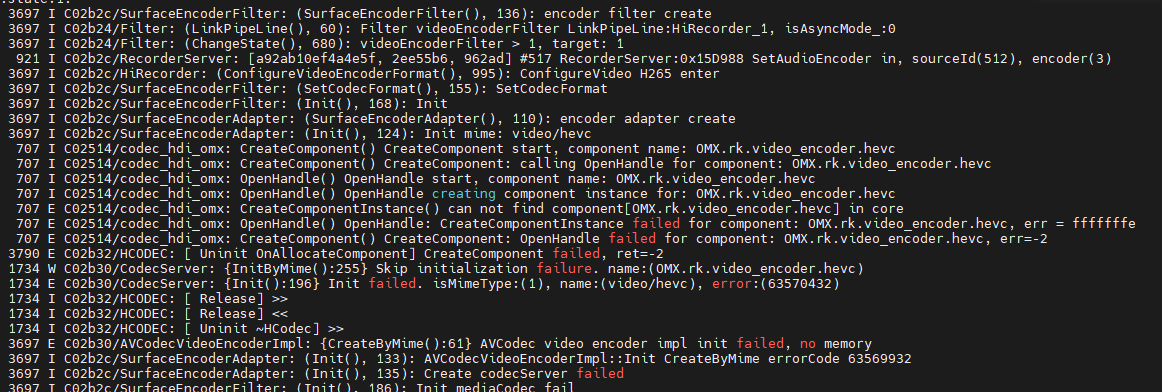 一般不走hdf框架,OMX_Core库都是芯片私有实现的。上图中是H265编码,libOMX_Core.z.so库中应该没定义该格式的组件,芯片不支持或者没适配。H264编码应该支持,可以先看看这个格式
