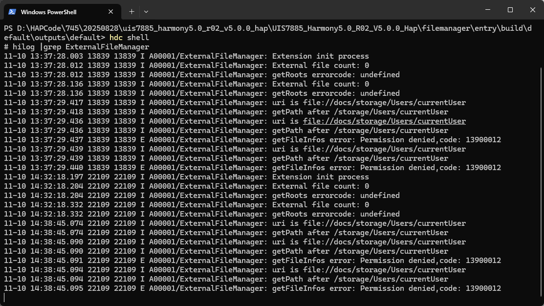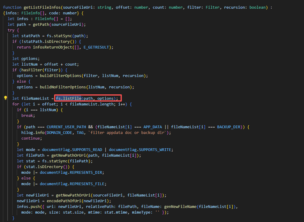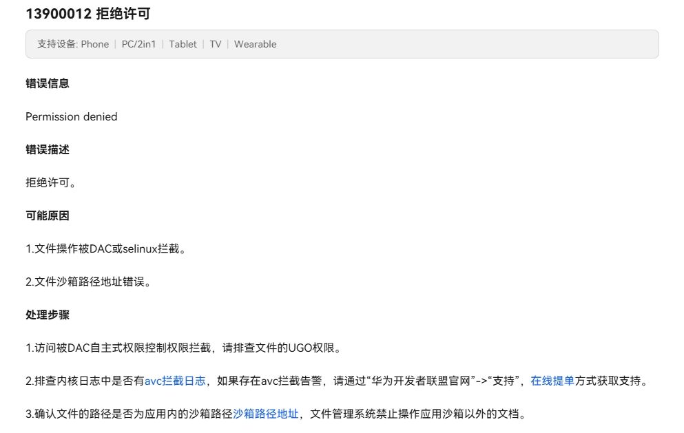 排查系统层方法,发现报错信息来自ts方法getListFileInfos(),然后通过添加对应日志定位到执行fs.listFile()时报错,具体报错信息为getFileInfos error: Permission denied,code: 13900012